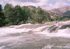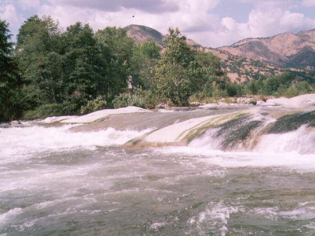 Mandatory scout at sloping 8 foot ledge, KEEPER at bottom! Very Dangerous drop at high flows, but if you insist on running it, enter 8 feet right of the boulder at the top, paddle like hell and cross your fingers. At high water it's best to take the chicken route off the slab 30 feet left of the main drop. One local boater can attest to the risks associated with trying to run this rapid at high water. The class 5 rating applies only at the higher levels. It's a cheap thrill class 3 at lower levels.