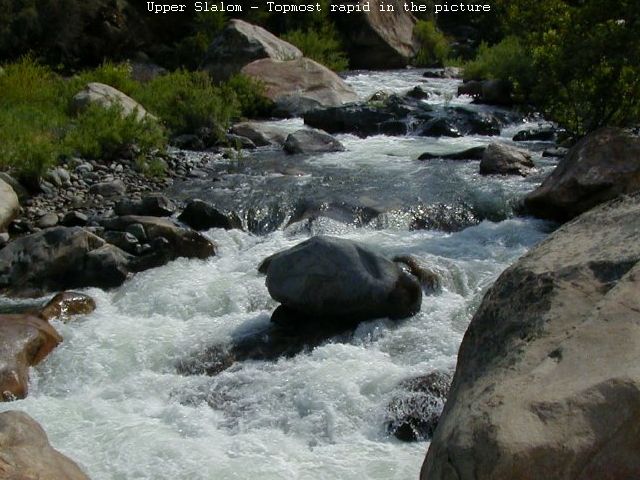 A short rapid that will try to push you up against the left wall. Below this rapid a channel with less water goes far left of an island into the The Wheelchair Route which might be a good choice at higher water to avoid the Steep Slalom ahead.