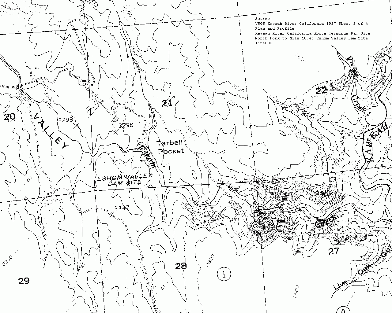 A bit of historic trivia. Back in 1957 when The Army Corps of Engineers was surveying for Terminus Dam near Lemon Cove they were also Surveying Eshom Valley for a Dam Site (click for map) at 3270 ft elevation. Since the North Fork Kaweah had alot of power potential the plan was to dam up and flood Eshom Valley with water diverted from the North Fork Kaweah via a tunnel. The North Fork and Eshom Creek would have been dewatered while generating power downstream somewhere, probably so far downstream as to ruin the North Fork for boating. Other additional dam sites were Dry Creek and the valley south of the Lemon Cove where water would be diverted from the Main Kaweah to increase the storage capacity of the Kaweah drainage.