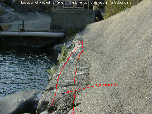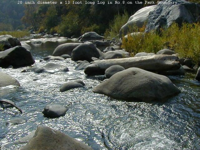 07-02-10 There is a hazard dangling over the diversion dam at the Park Boundary. It is the Edison Company log boom that guards the intake facility for the flume serving Kaweah Plant No. 2. It has been