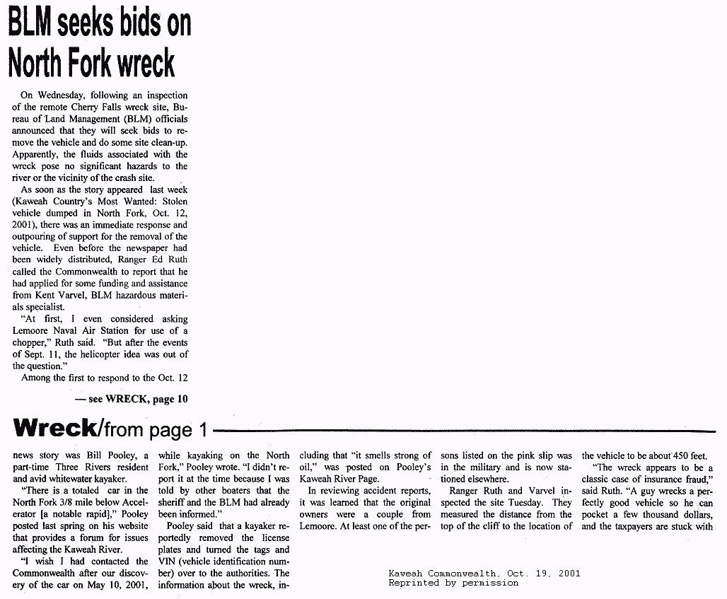 promptly and had the wreck removed from the canyon on Oct. 22, 2001. The BLM is to be commended and thanked for their action! Thanks